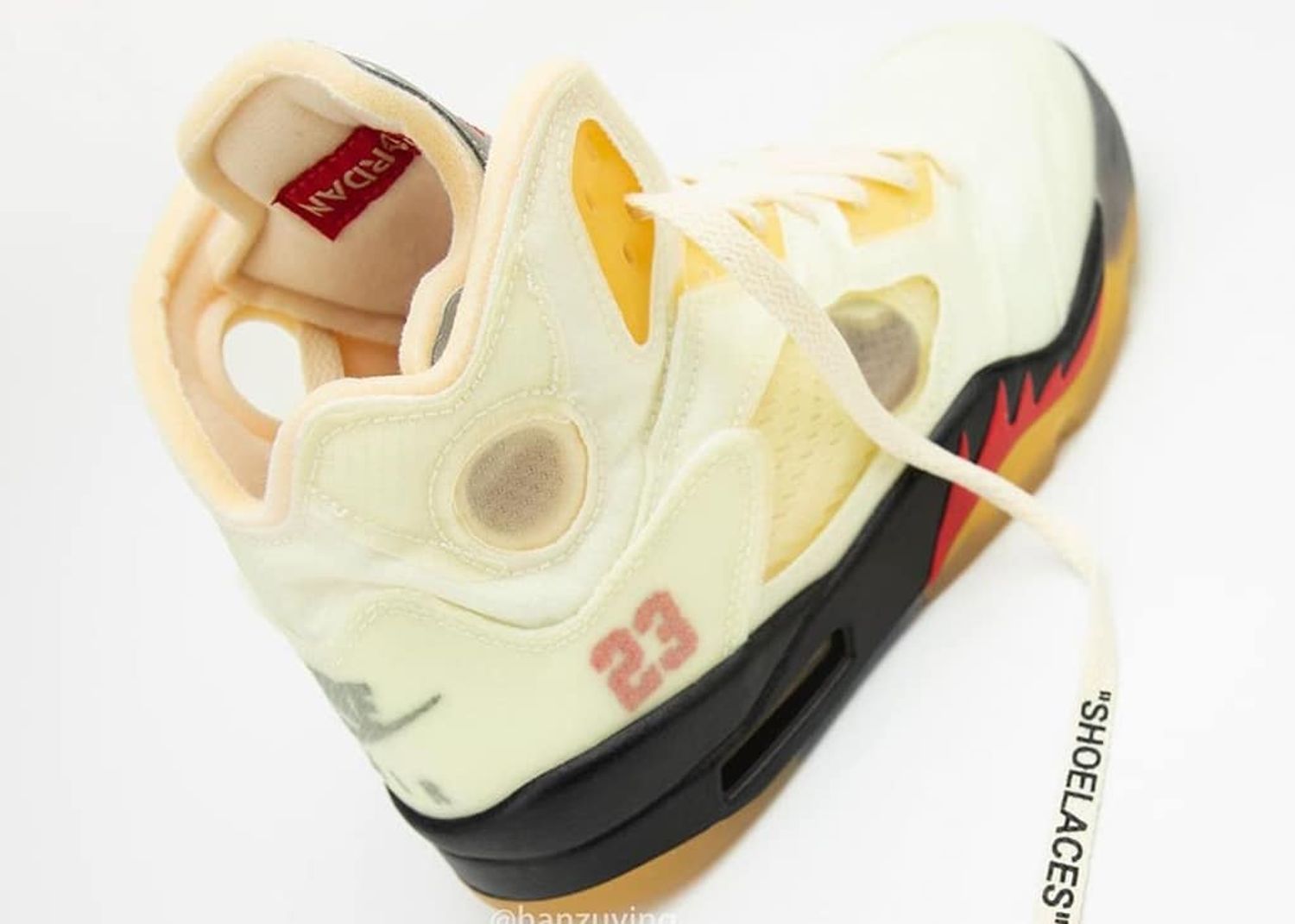 Afgelopen jaar zagen we al een Air Jordan 5 'Off-White', ontworpen door Virgil Abloh. Die schoen viel ons een beetje tegen. Het materiaal week iets af van de normale Air Jordan 5 en er zaten wat 'gaten' links en rechts in de schoen. Het was in ieder geval niet wat wij verwacht hadden van een Off White Air Jordan 5. Deze nieuwe colorway maakt gelukkig meer indruk! We schreven recent al over de 'Sail' Air Jordan 4, samen met Off White. Daar wordt nu ook een Air Jordan 5 aan toegevoegd.